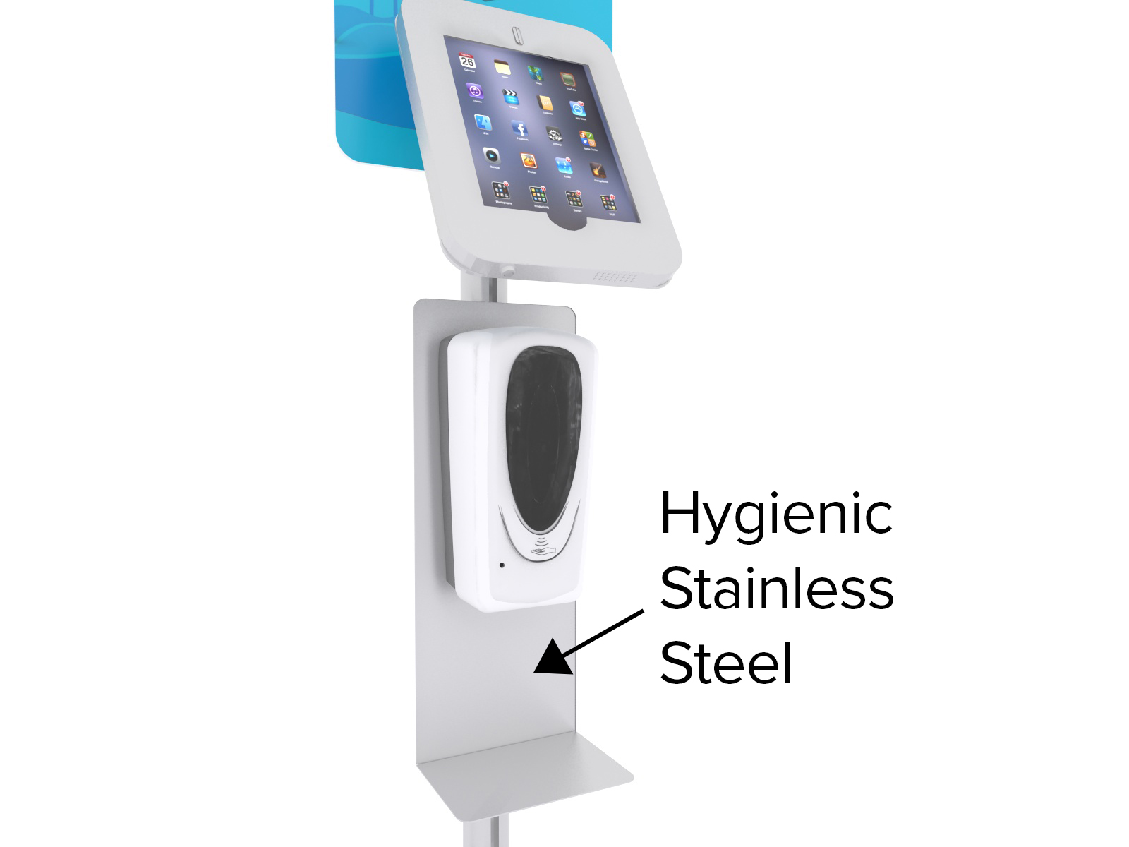 MOD-1379 Hand Sanitizer / iPad Stand -- View 2MOD-1379 Hand Sanitizer / iPad Stand -- View 3MOD-1379 Hand Sanitizer / iPad Stand -- View 4Stainless Steel Mounting Plate and TrayiPad Clamshell with Dual LocksPortrait to Landscape SwivelDurable Engineered Aluminum ExtrusionOPTIONAL:  Automatic Sanitizer Dispenser with Touch-Less Sensor